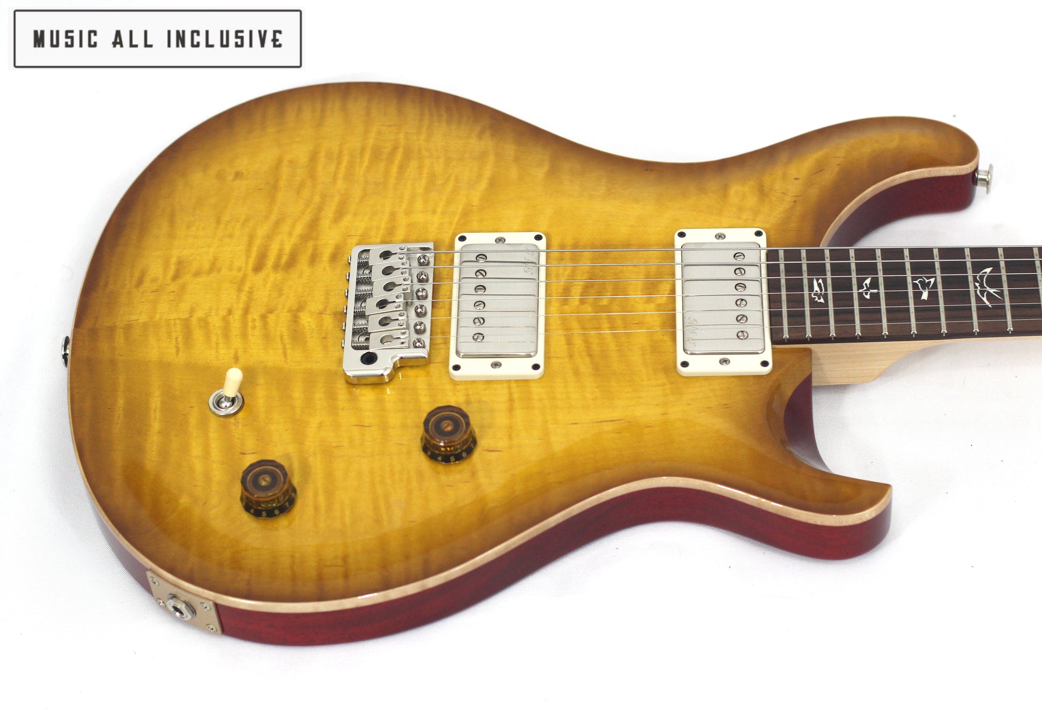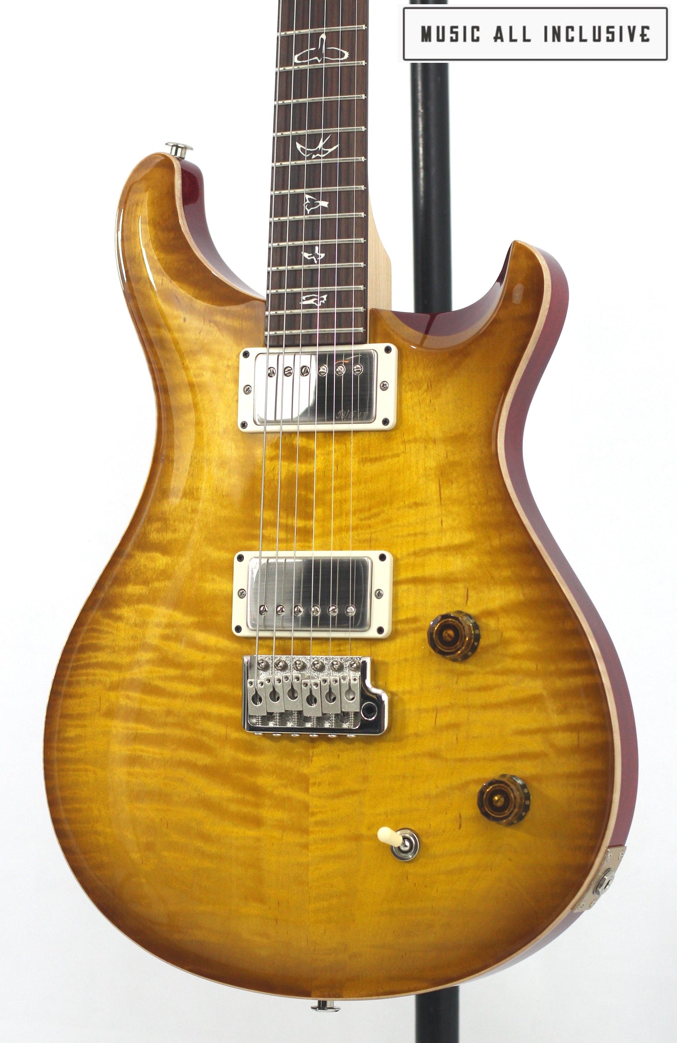 Su cuerpo de caoba con tapa de maple tallado (carved maple top) produce un sonido balanceado, con medios ricos y agudos definidos. El mástil de arce atornillado con diapasón de palisandro (rosewood) brinda un ataque brillante y una sensación cómoda y ágil.